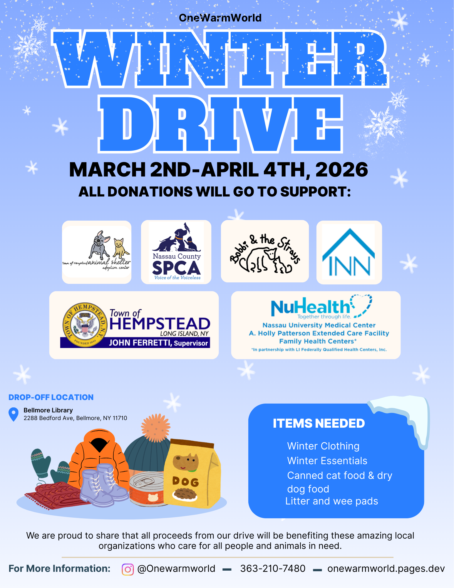 Click Here to View FlyerWeโre excited to launch One Warm World. Our mission is to make clothing and care accessible to people and animals in need through community-driven donations and youth leadership. Stay tuned for future drives and additional community updates!